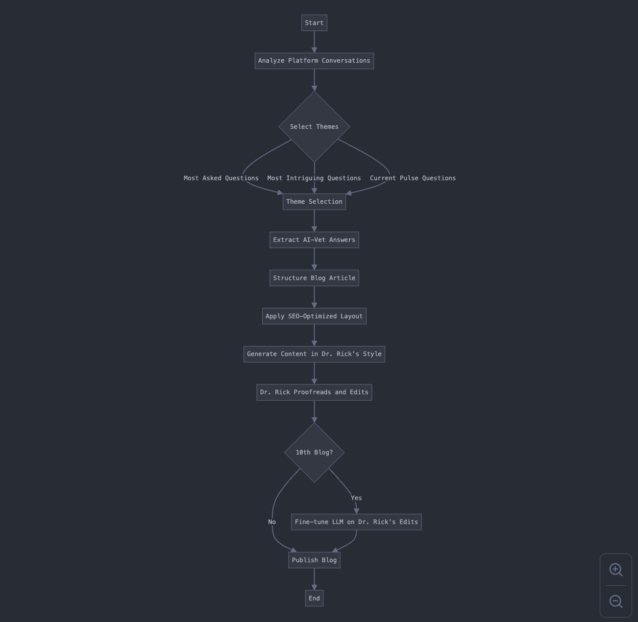 For our partner and client a pet veterinary platform, we wanted to automate SEO content creation but make it curious, intriguing and grounded in reality. We look for current trends, take real issues that pet owners are facing and have the blogs generated in style of Dr. Rick Dumm the CEO (and Vet) of Datag, the company behind pet-vet platform.