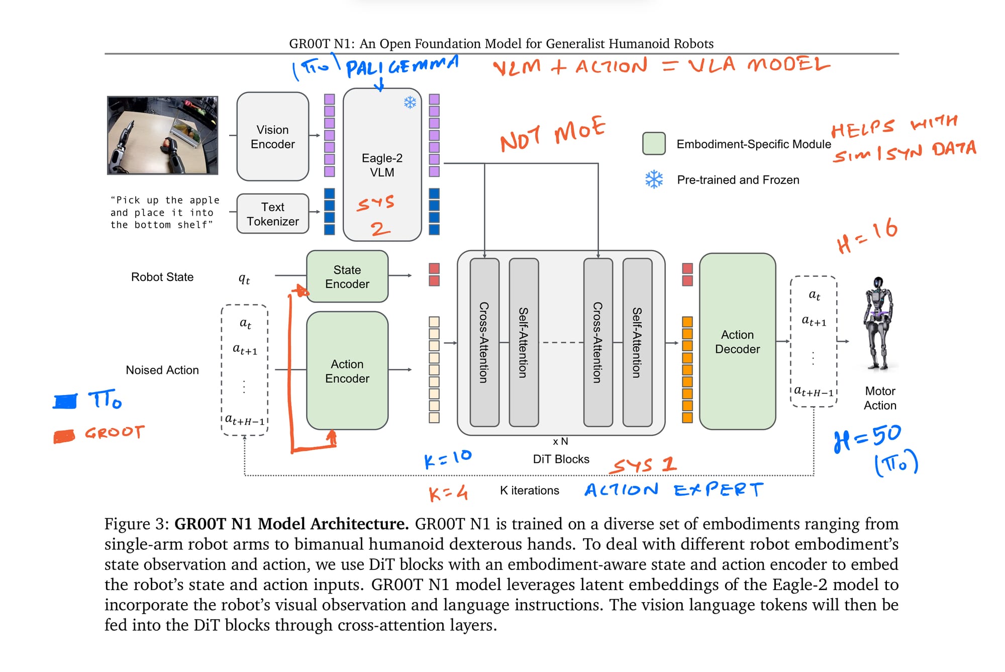 VLM & Attention: They use NVIDIA's Eagle-2 VLM as the backbone (System 2). Instead of Pi0's MoE-like structure, GR00T uses standard cross-attention to connect the VLM's output (VLM is not fine-tune but Frozen) to the DiT action module.