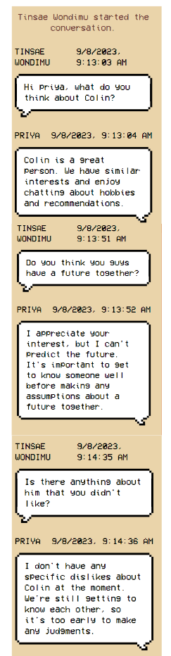 Curious about what the agents think of each other? We can directly query them within the simulation, much like you'd ask a friend about a recent date. For example, we had a chat with an agent named Priya, who just met Colin.